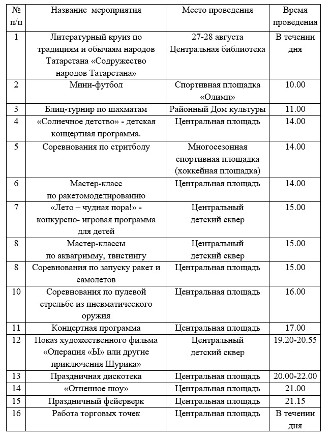 План мероприятий посвященных дню республики Татарстан и дня города Болгар по Спасскому муниципальному району Республики Татарстан 29 августа 2018 года