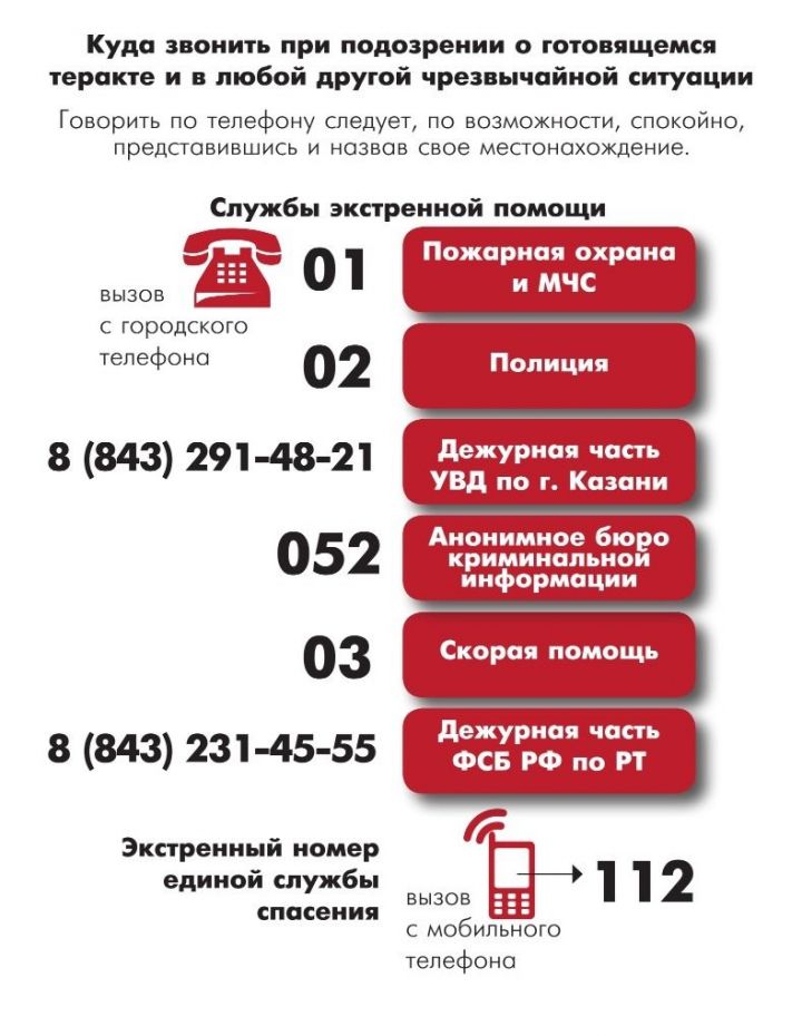 Немедленно сообщите об этом в экстренные службы по телефонам 02, 112, а также органы ФСБ (231-45-55) или МВД по РТ (291-35-28, 291-36- 28)