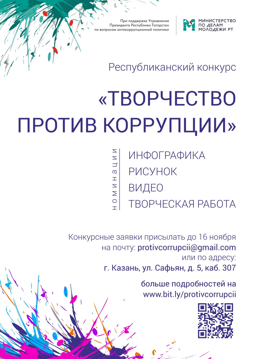 Куда подавать заявку. Конкурсные материалы принимаются до 16 ноября 2018 года в новом здании Министерства по адресу: г. Казань, ул. Сафьян, д.5, каб.307 или по электронной почте protivcorrupcii@gmail.com. Количество заявок от одного участника не ограничено.