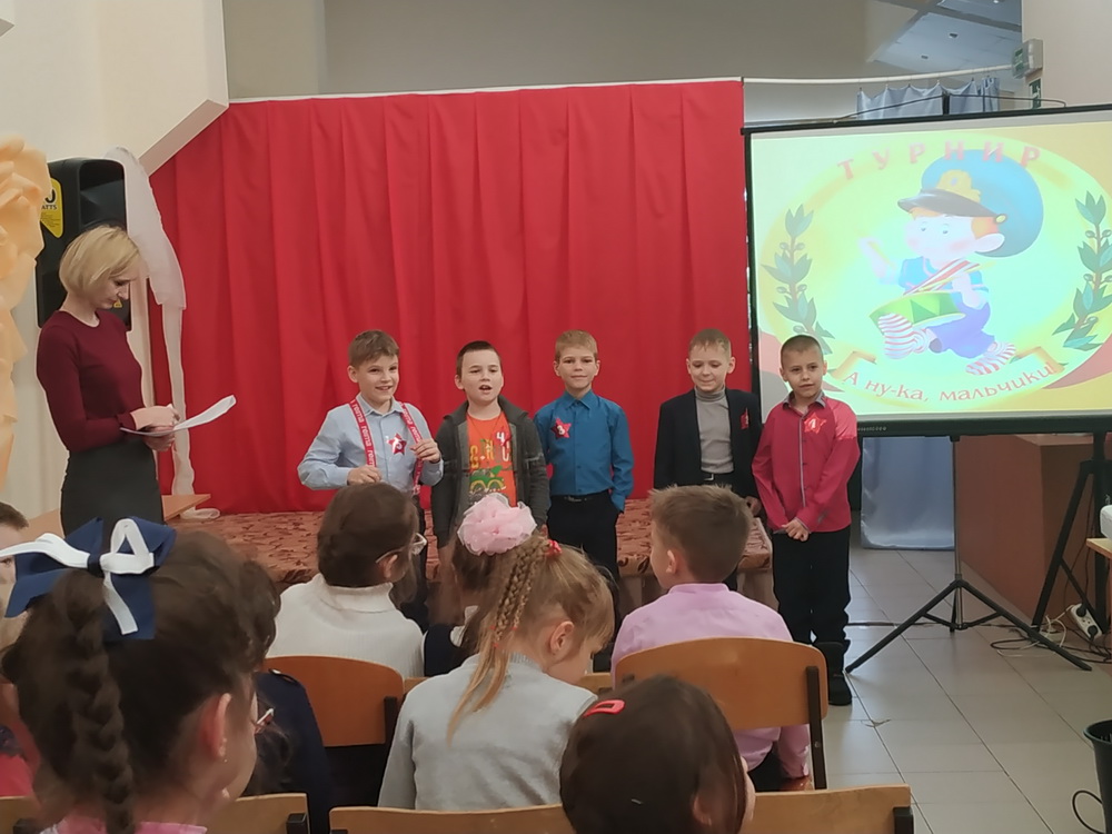 Для соревнований из зала выбрали 5 мальчиков. Турнир состоял из 7 конкурсов: наш солдат умом богат (каждому участнику нужно было ответить на 3 вопроса), самый быстрый (как можно быстрее собрать пазл), отважный лётчик (сделать самолёт и запустить его, по дальности полёта подводились итоги), меткий глаз (необходимо было каждому участнику закинуть по 5 мячей в корзину), шифровальщик (каждому участнику давался набор букв и из них нужно было составить слово, выигрывает тот участник, который составит слово правильно и быстро), самый музыкальный (нужно было угадать мелодии из мультфильмов, побеждает тот кто больше угадает мелодий), танцевальный (задача конкурсантов повторять движения за человеком на экране).