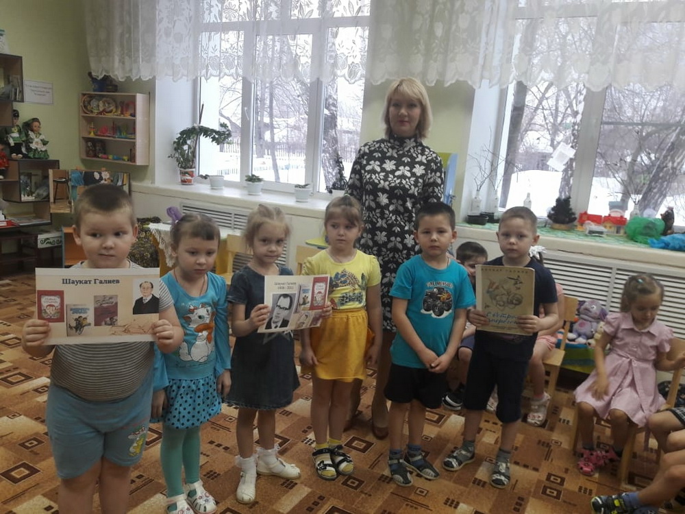 1. Для старшей группы детей детского сада «Колосок», сотрудники детской библиотеки провели громкое чтение «Веселые стихи Шауката Галиева».