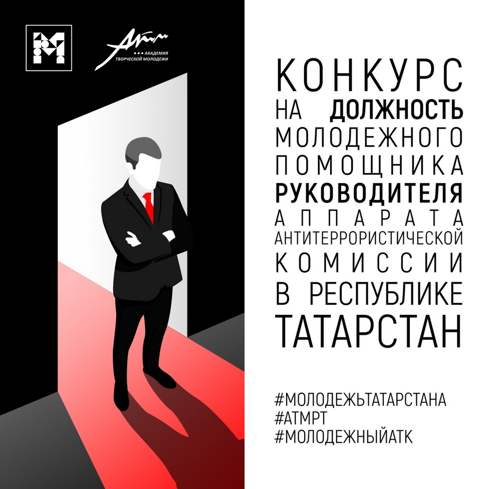 В рамках реализации мероприятий подпрограммы «Профилактика терроризма и экстремизма в Республике Татарстан на 2014-2021 годы» Министерством совместно с Региональной общественной организацией «Академия творческой молодежи Республики Татарстан» при поддержке аппарата Антитеррористической комиссии в Республике Татарстан проводится Конкурс на должность молодежного помощника Руководителя аппарата Антитеррористической комиссии в Республике Татарстан (далее – Конкурс).