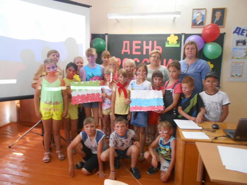 Двенадцатый день лагеря - «День России». В ходе мероприятия сельский библиотекарь Хусаинова Л.М. говорила о символах России, об исторических местах Татарстана: Остров – град Свияжск, заповедник Великие Болгары, Билярск, Елабужский парк, Храм в Чистополе и показывала слайды. Ребята активно участвовали в беседе о символах России, отвечали на вопросы, в конце все спели гимн РФ.