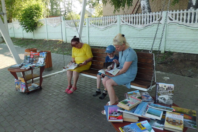 Ко Дню России в Центральной библиотеке начал работу летний читальный зал «Попутный книжный ветер», который расположен на площадке у библиотеки. Прохожие, отдыхающие, имеют возможность почитать литературу, познакомиться с журналами и газетами прямо под открытым небом, отдыхая на качелях.