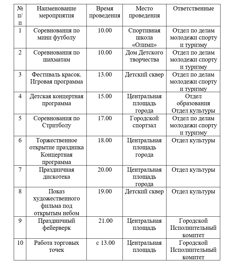 План мероприятий, посвященных дню Республики Татарстан и дню города Болгар по Спасскому муниципальному району РТ на 30 августа 2019 года