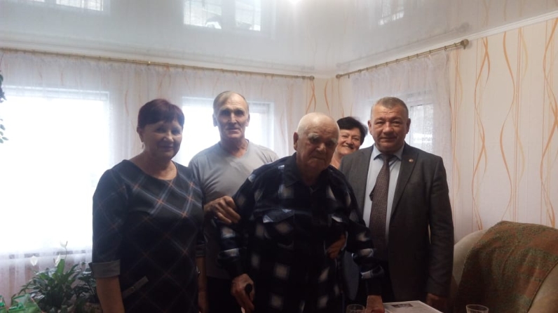 Вручил Михаилу Алексеевичу поздравительную открытку от Президента Российской Федерации В.В. Путина, от своего имени, а также продуктовый набор. Также юбиляра поздравили представитель совета ветеранов, сотрудники социальной защиты, родные и близкие.