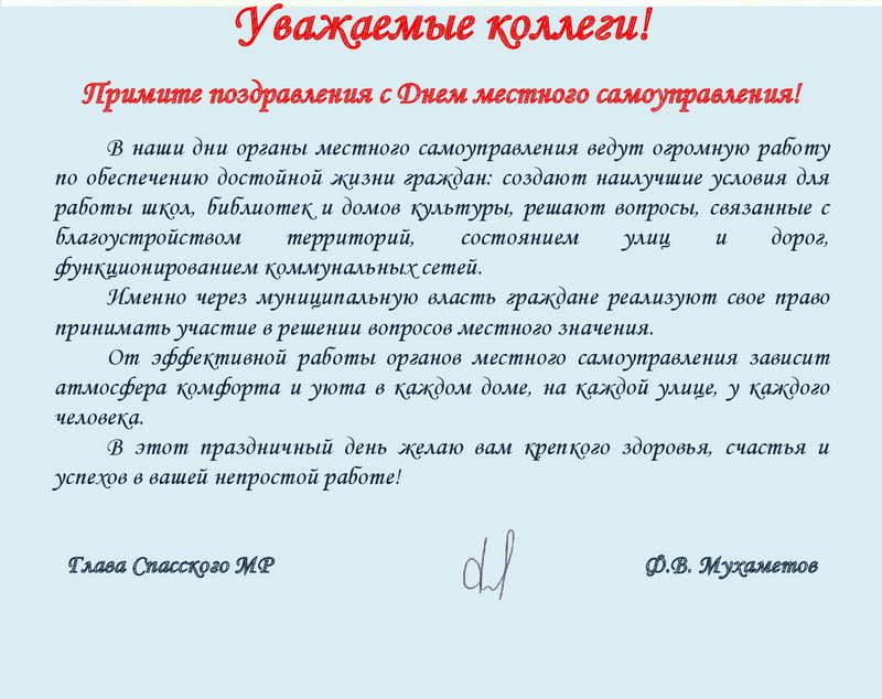 Поздравление главы Спасского района Ф.В. Мухаметова с Днем местного самоуправления