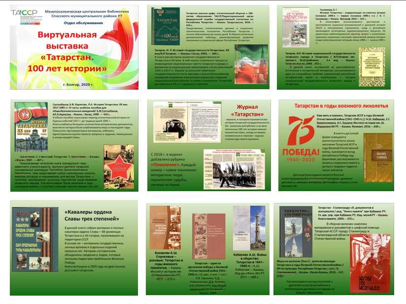 Отдел обслуживания центральной библиотеки предлагает к просмотру виртуальную выставку «Татарстан. 100 лет истории», посвящённую 100-летию ТАССР. Представленная литература имеется в фонде центральной библиотеки. Материалы выставки размещены на сайте bolgarbiblio.ru, а также страницах «Читай! Болгар» социальных сетей «ВКонтакте» и «Инстаграм».