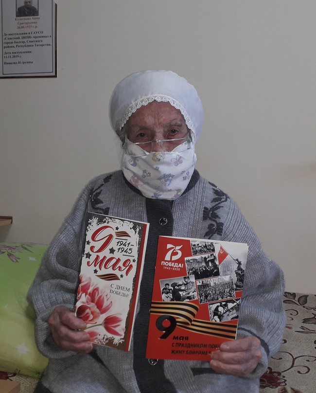 Сегодня ветеранам ВОВ, труженикам тыла - проживающим в Спасском доме-интернате Сунгатуллиной Х.А., Кузнецовой А.Г., Сахаровой Т.А., Золиной А.В., Прокофьевой В.П., Нургалеевой Р.Н. директор Алевтина Владимировна вручила поздравительные открытки и подарки от имени Президента РФ Путина В.В., Президента РТ Миниханова Р.Н., Главы Спасского муниципального района РТ Мухаметова Ф.В. с добрыми, светлыми пожеланиями. Мы гордимся Вами, Вашими трудовыми заслугами и подвигами. Мы говорим, Вам слова благодарности за подаренные нам мир.