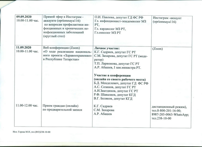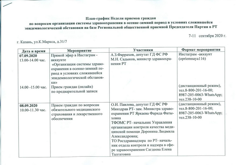 Приемы будут осуществляться с привлечением депутатов фракции «ЕДИНАЯ РОССИЯ», представителей исполнительной и государственной власти в сфере здравоохранения. Предварительная запись по телефону: Региональная общественная приемная – 8 (843) 238-10-00, Спасская местная общественная приемная – 3-09-53.