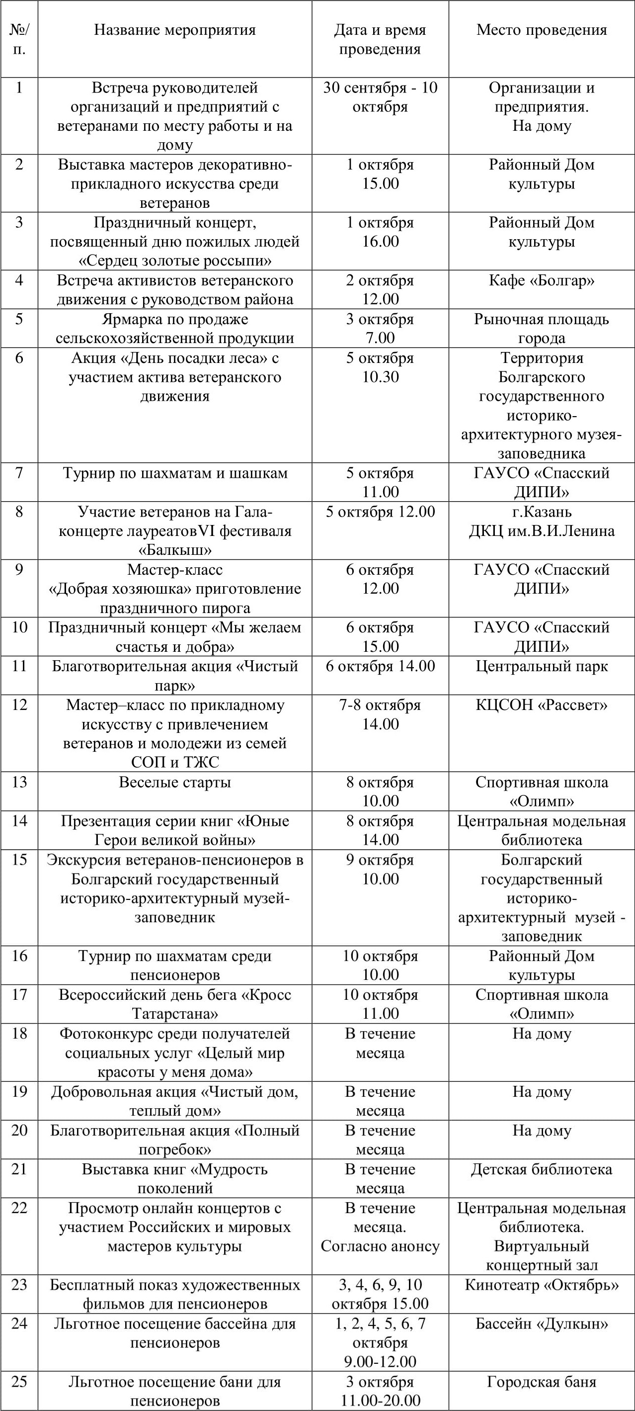 План основных культурно-массовых и спортивных мероприятий, посвященных Международному дню пожилых людей по Спасскому муниципальному району Республики Татарстан 2020 года