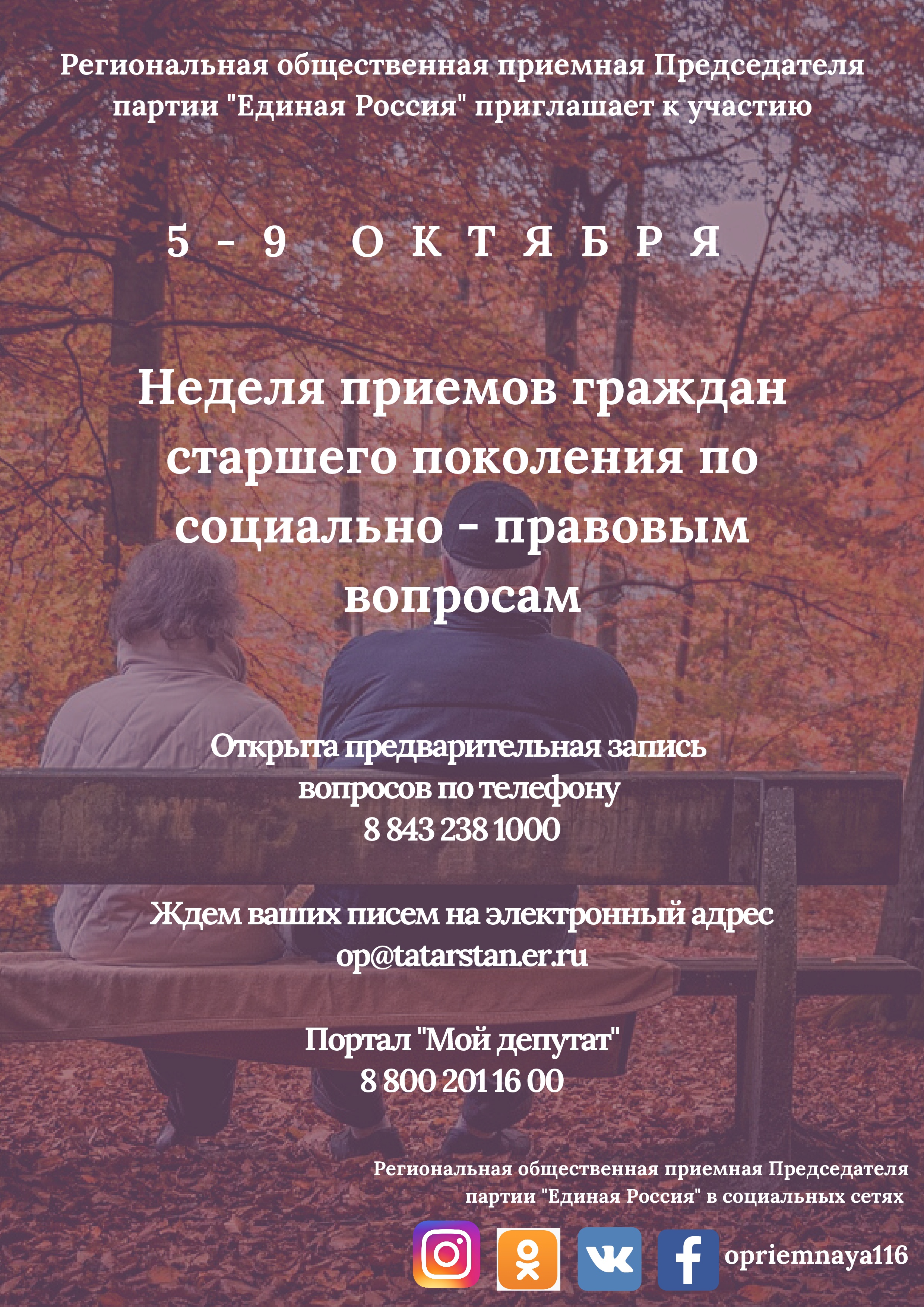 С 5 октября по 9 октября 2020 года в Региональной и Спасской местной общественной приемной Партии «ЕДИНАЯ РОССИЯ» будет проводиться в дистанционном режиме Неделя приемов граждан старшего поколения по социально-правовым вопросам, приуроченного к Международному дню пожилых людей с привлечением депутатов фракции «ЕДИНАЯ РОССИЯ», представителей исполнительной и государственной власти в сфере здравоохранения и социальной защиты населения. Предварительная запись по телефону: Региональная общественная приемная - 8843-238-10-00, Спасская местная общественная приемная – 3-09-53.