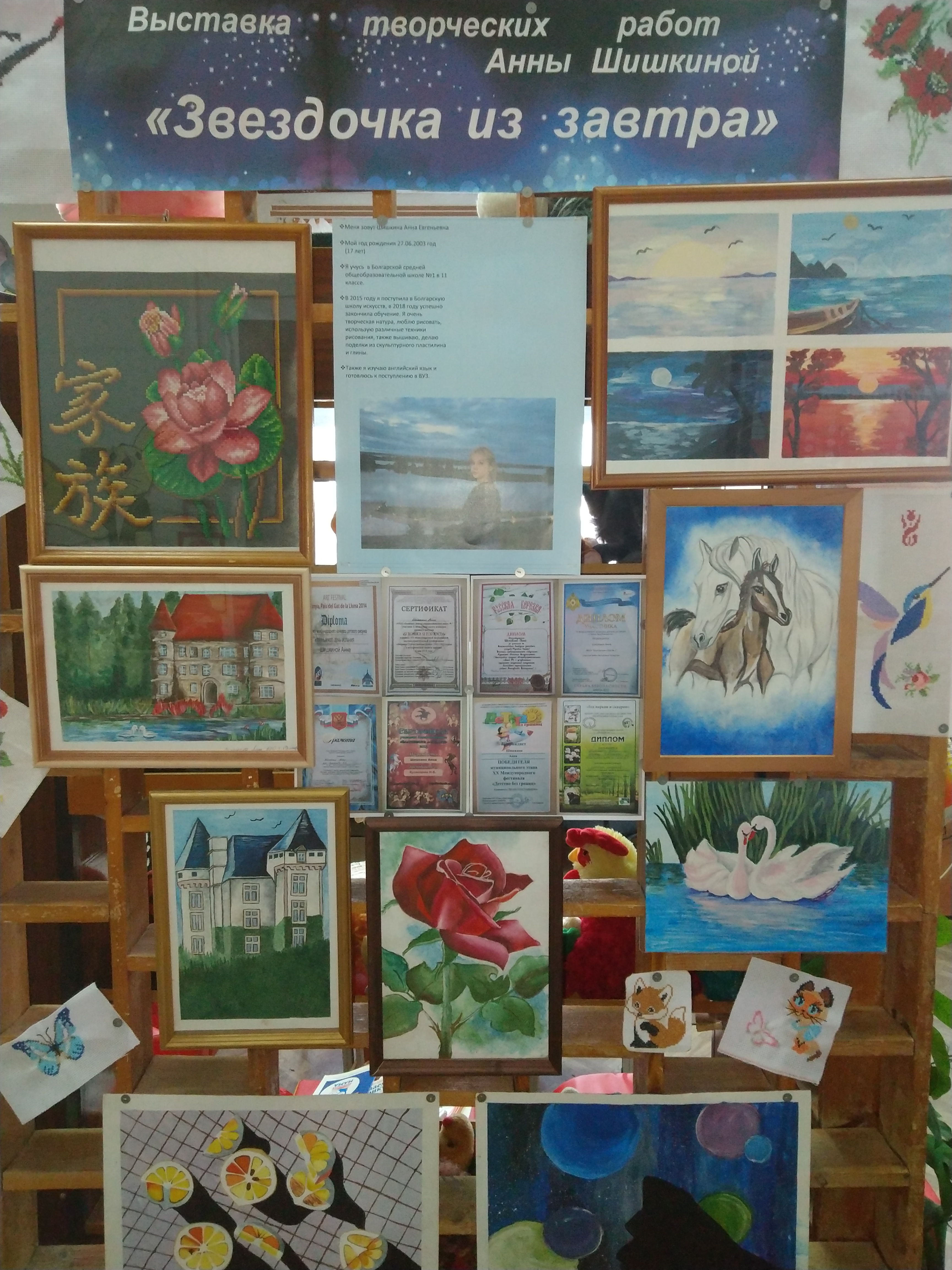 В детской библиотеке оформлена выставка творческих работ «Звездочка из завтра», на которой представлены картины и вышивки Анны Шишкиной (в рамках мероприятий, посвященных празднованию 100-летия ТАССР).