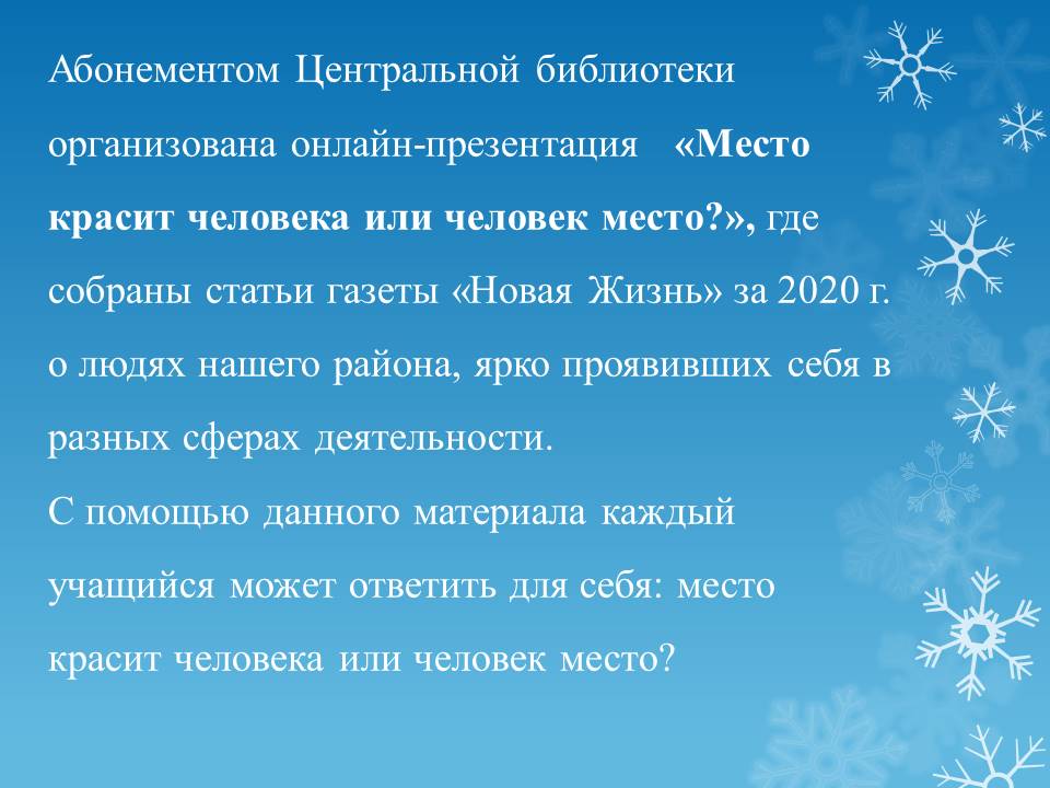 Абонементом Центральной библиотеки организована онлайн-презентация «Место красит человека или человек место?», где собраны статьи газеты «Новая Жизнь» за 2020 г. о людях нашего района, ярко проявивших себя в разных сферах деятельности. С помощью данного материала каждый учащийся может ответить для себя: место красит человека или человек место?