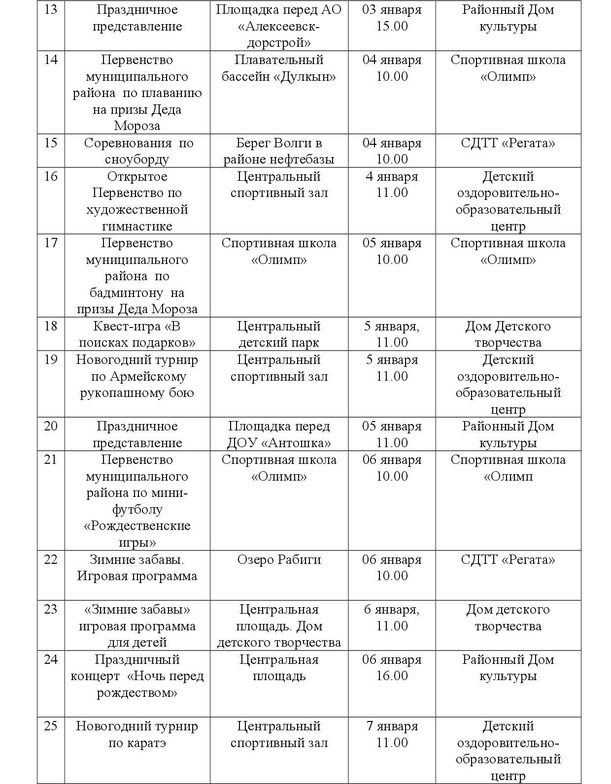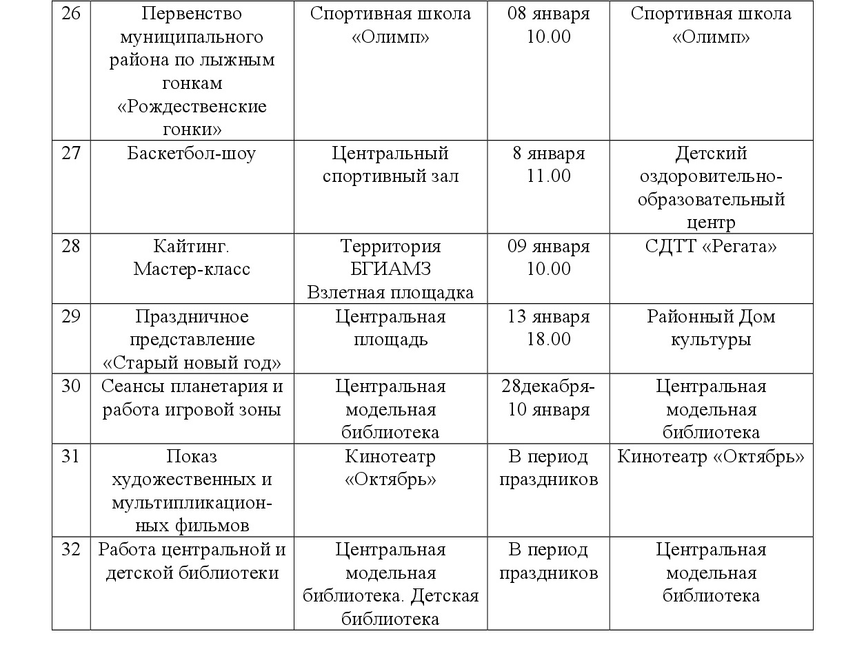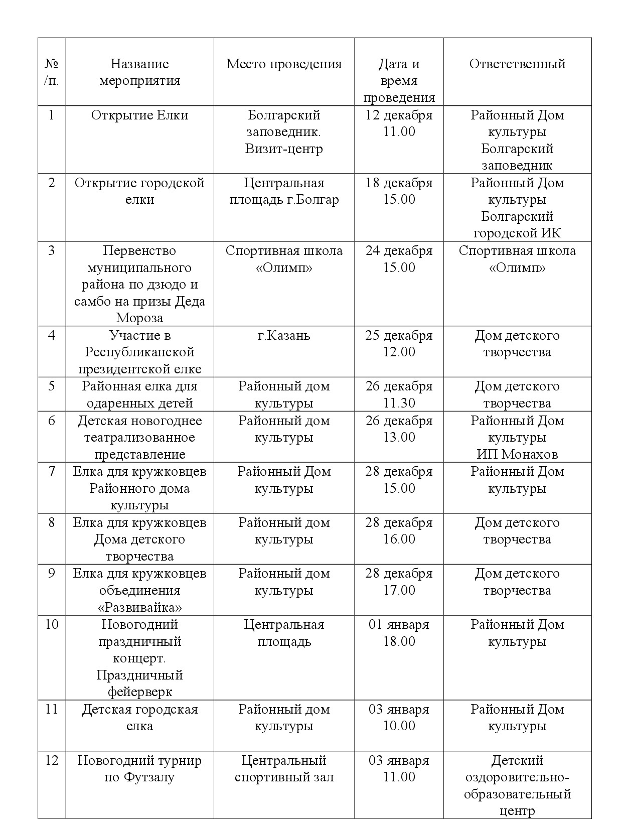 План основных новогодних культурно-массовых и спортивных мероприятий по Спасскому муниципальному району РТ