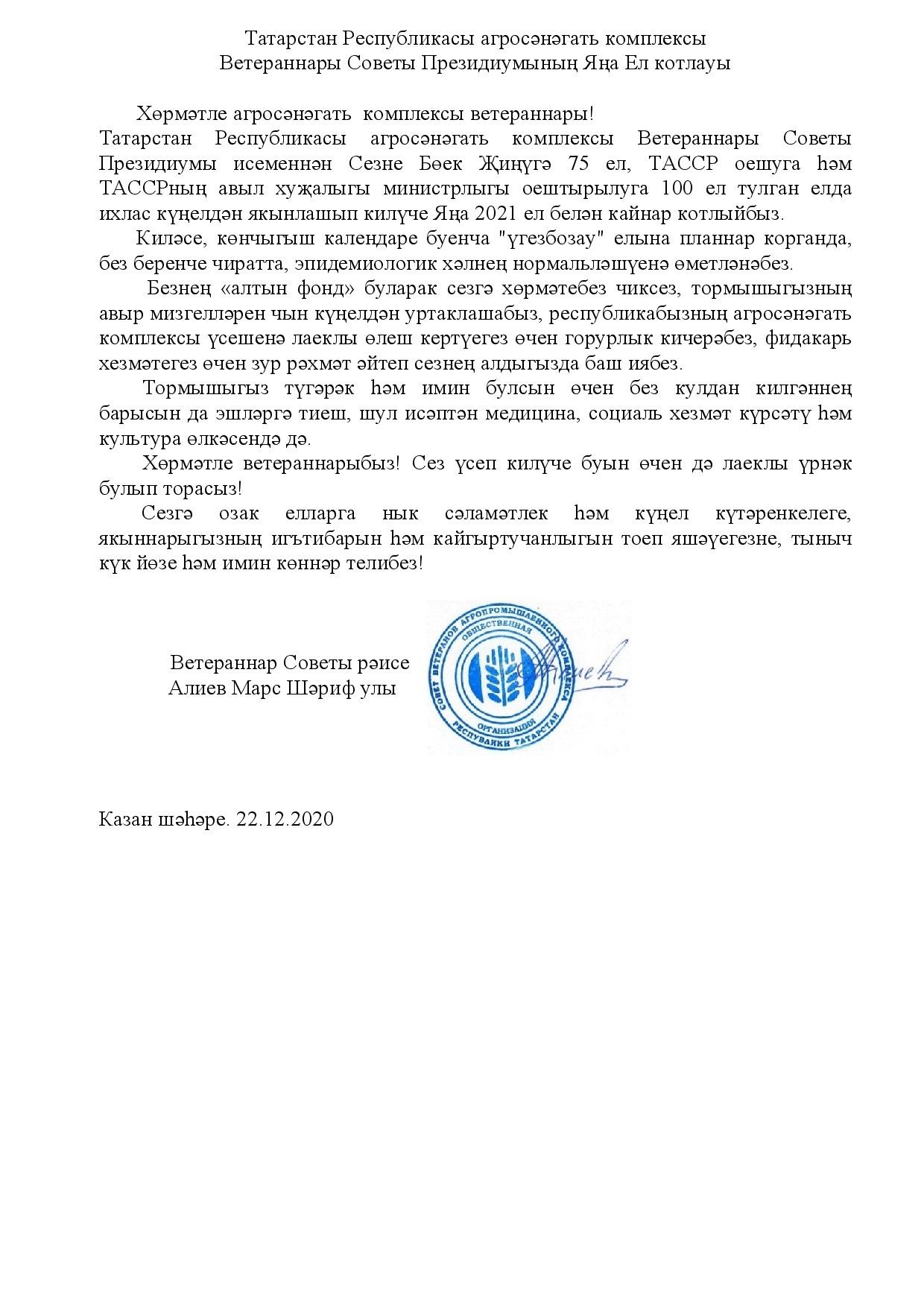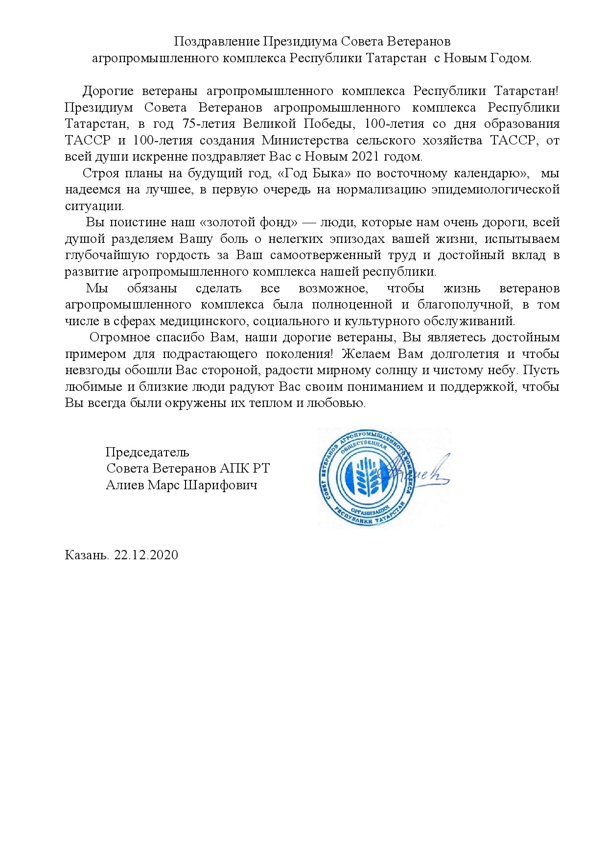 Поздравление ветеранов агропромышленного комплекса Республики Татарстан