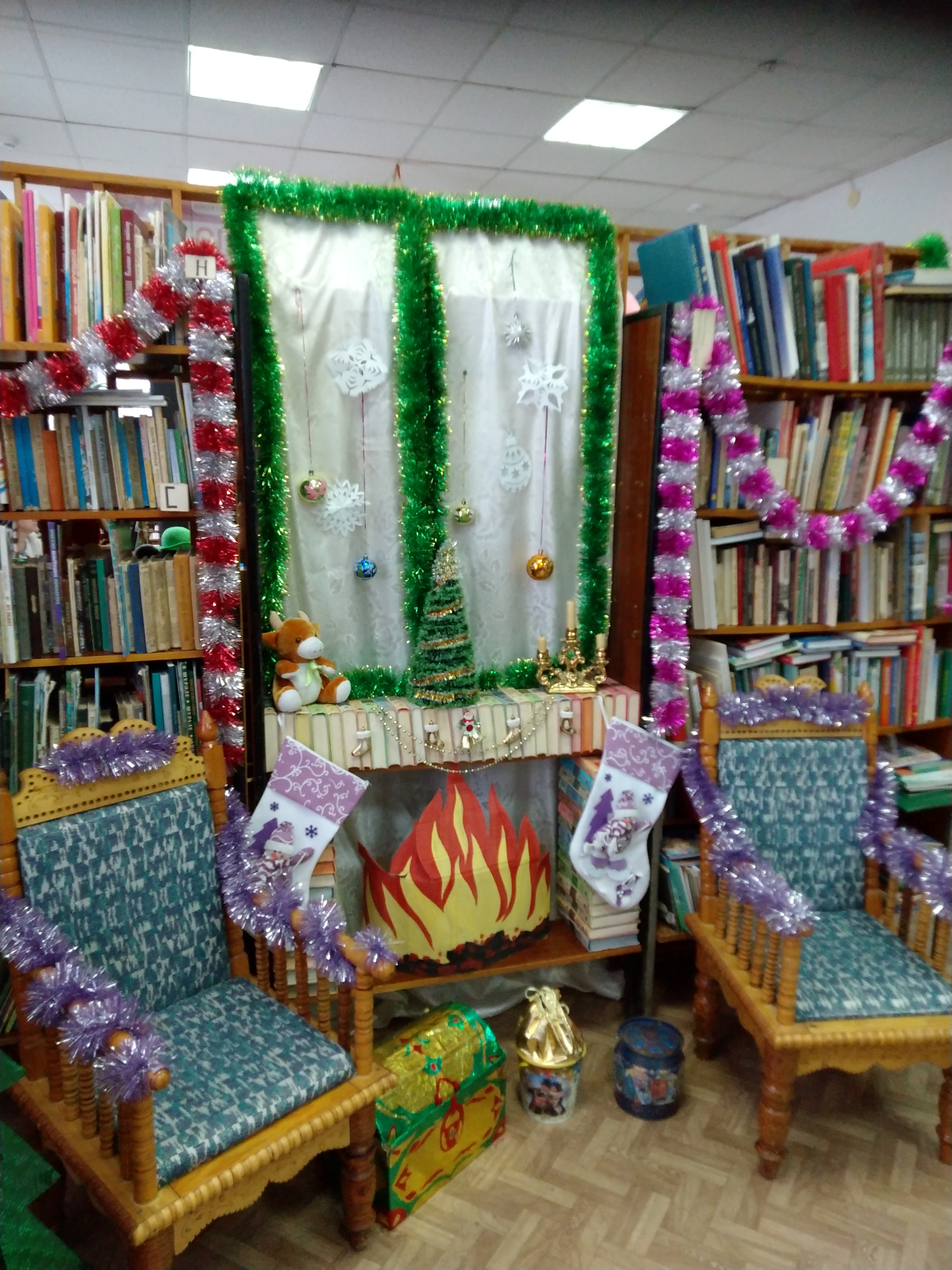 Также, для создания новогодней атмосферы, сотрудники детской библиотеки постарались внести немного креатива и веселья, соорудив необычный, яркий, уютный уголок – праздничную инсталляцию, где можно не только посидеть, отдохнуть с книгой и журналом, но и поиграть, сделать незабываемое фото на память.