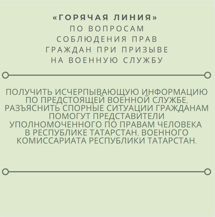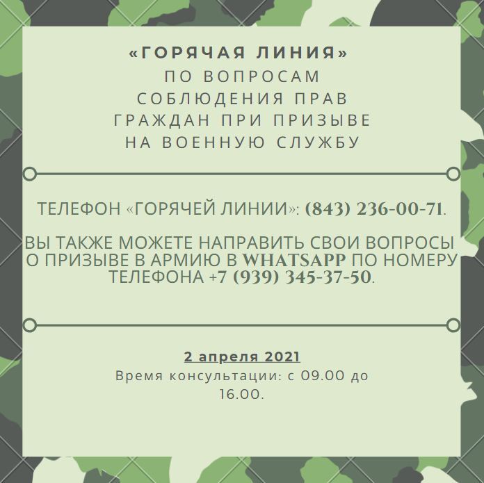 02 апреля 2021 года Уполномоченный по правам человека совместно с Военным комиссариатом Республики Татарстан проводит «горячую линию» по вопросам соблюдения прав граждан при призыве на военную службу.