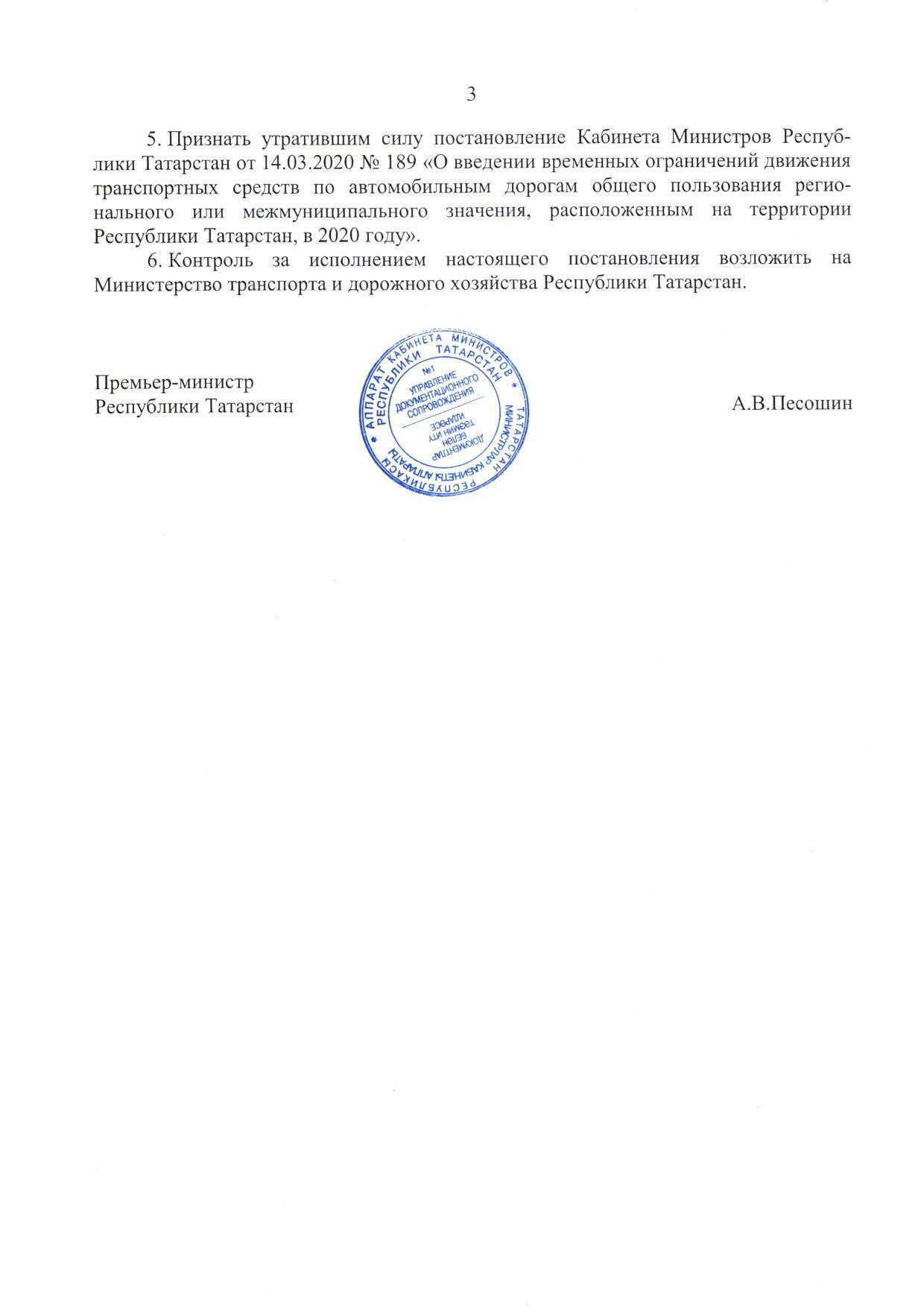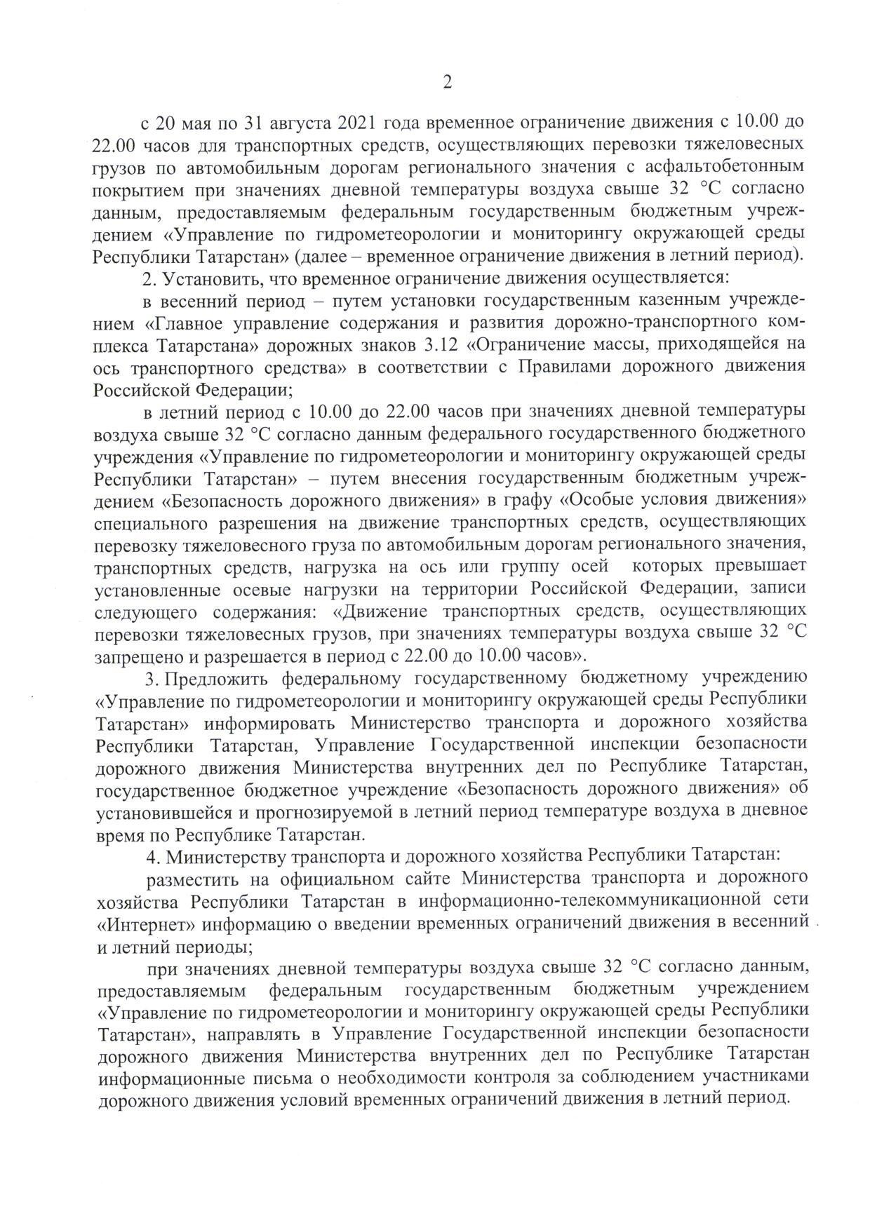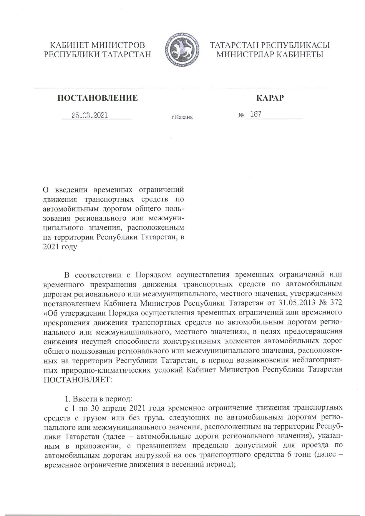 Постановление Кабинета Министров РТ о введении временных ограничений движения транспортных средств по автомобильным дорогам общего пользования регионального или межмуниципального значения, расположенным на территории Республики Татарстан, в 2021 году