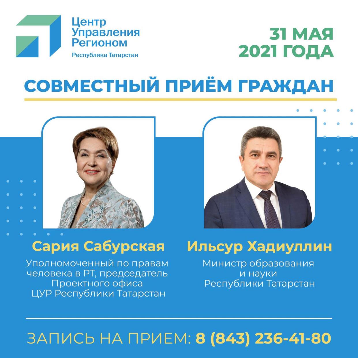 31 мая 2021 года с 14.00 до 16.00 в Аппарате Уполномоченного по правам человека в Республике Татарстан (г. Казань, ул. Карла Маркса, д. 61) состоится совместный прием граждан Уполномоченным по правам человека в Республике Татарстан и министром образования и науки Республики Татарстан.