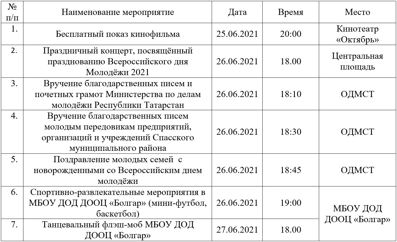 План мероприятий Спасского муниципального района, посвящённый празднованию Всероссийского дня молодёжи