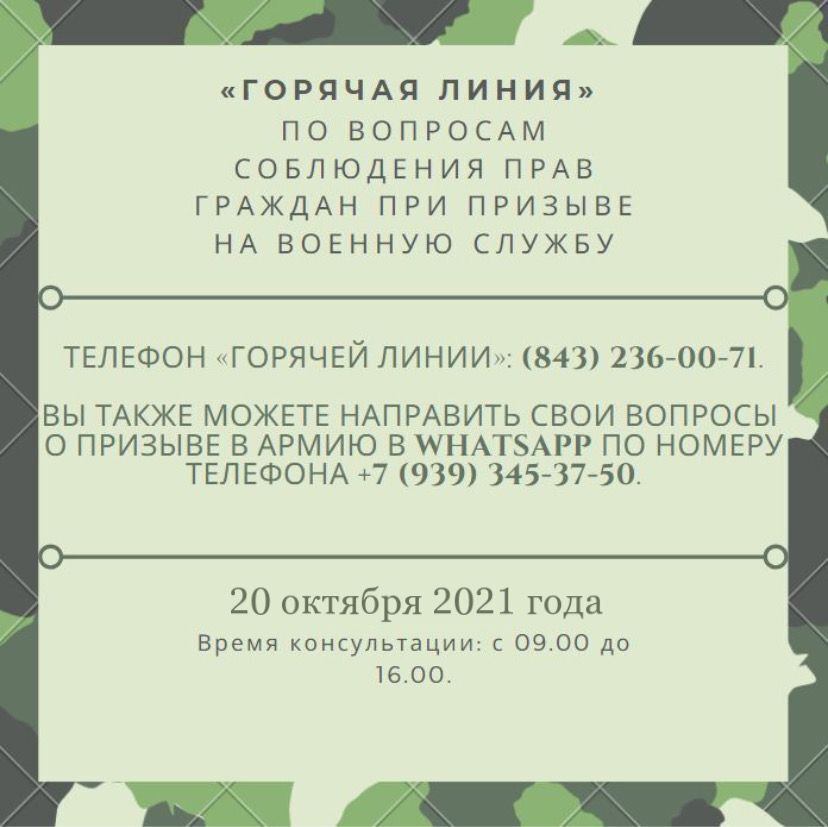 20 октября 2021 года Уполномоченный по правам человека совместно с Военным комиссариатом Республики Татарстан проводит «горячую линию» по вопросам соблюдения прав граждан при призыве на военную службу.