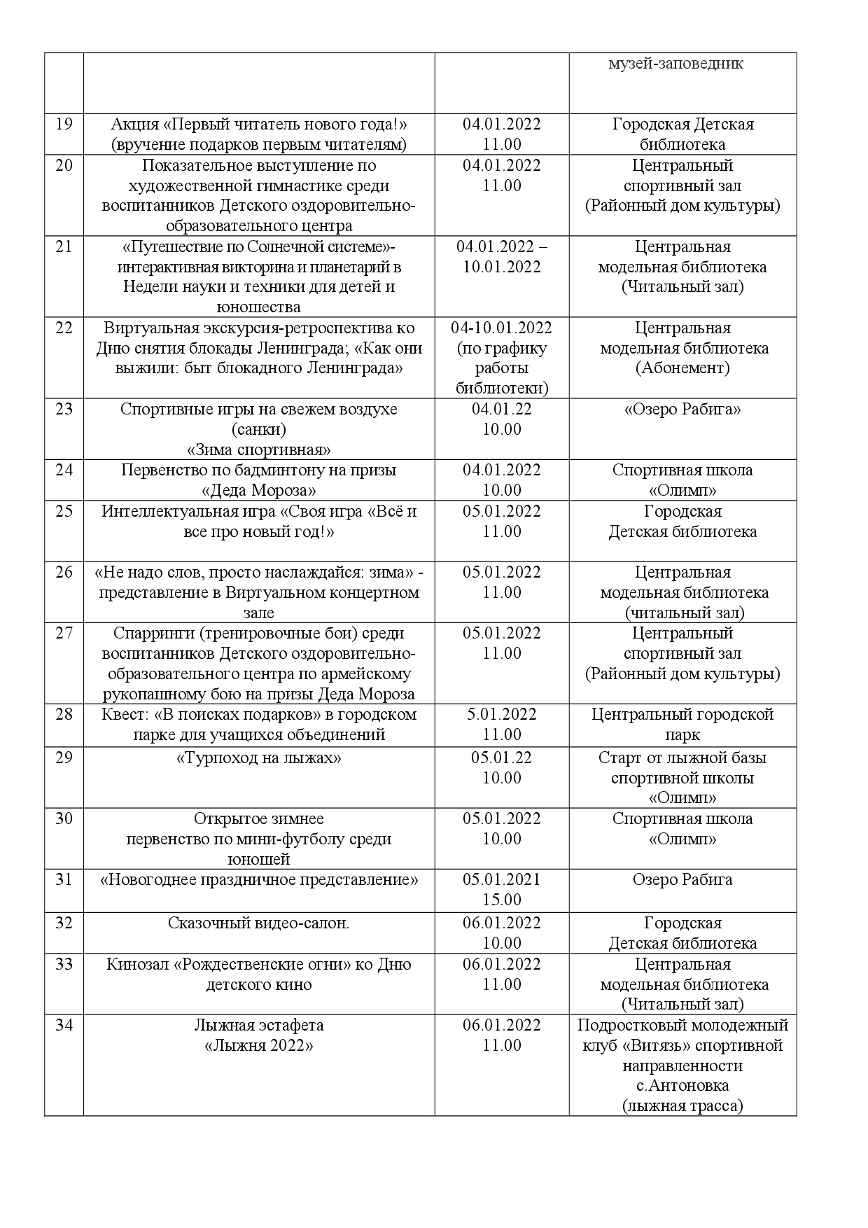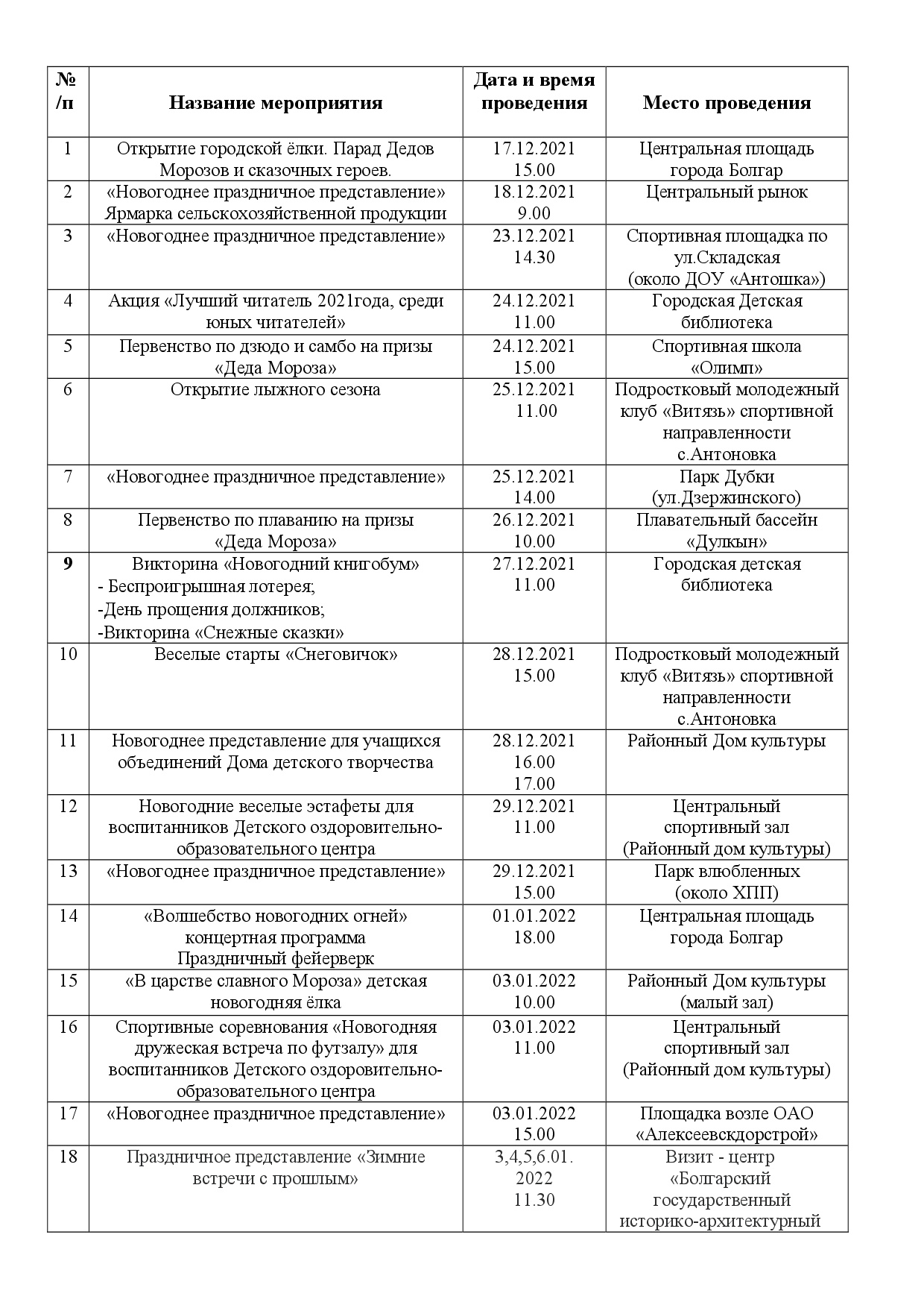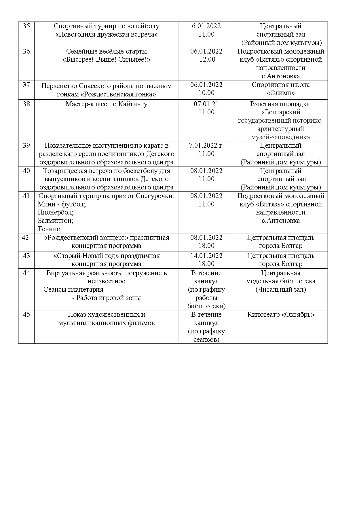 План Новогодних культурно-спортивных мероприятий по Спасскому муниципальному району РТ с 17.12.2021 по 14.01.2022 года