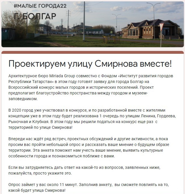 Сейчас архитекторы готовят конкурсную заявку от Болгара на Всероссийский конкурс малых городов. При работе над проектом благоустройства команде очень важно, каким представляете будущее этой территории вы — жители города.