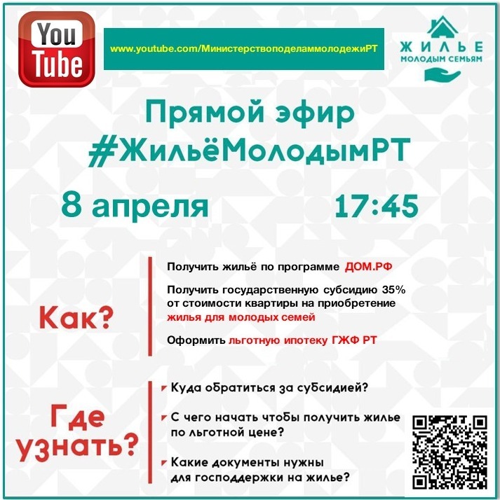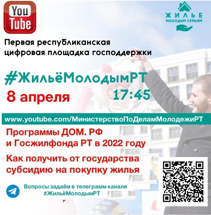 8 апреля 2022 года в 17.45 Министерство по делам молодежи Республики Татарстан проводит прямой эфир #ЖильёМолодымРТ с трансляцией на YouTube канале в целях информирования молодежи о действующих в Республике Татарстан программах и мерах государственной поддержки молодых семей, молодых специалистов в приобретении льготного жилья в 2022 году в условиях внешнего секционного давления.В ходе прямого эфира в доступной и подробной форме будут представлены федеральные жилищные проекты АО «ДОМ.РФ» («Льготная ипотека» на новостройки, «Семейная ипотека» на покупку и рефинансирование, «Сельская ипотека»), специалисты Госжилфонда РТ расскажут о республиканской молодёжной жилищной программе «Молодая семья» в системе льготной ипотеки ГЖФ РТ (7% годовых на срок до 28.5 лет и первоначальным взносом в 10% от стоимости жилья), о государственных субсидиях для молодых семьей 35% от стоимости жилья – на улучшение жилищных условий по программе «Обеспечение жильем молодых семей».