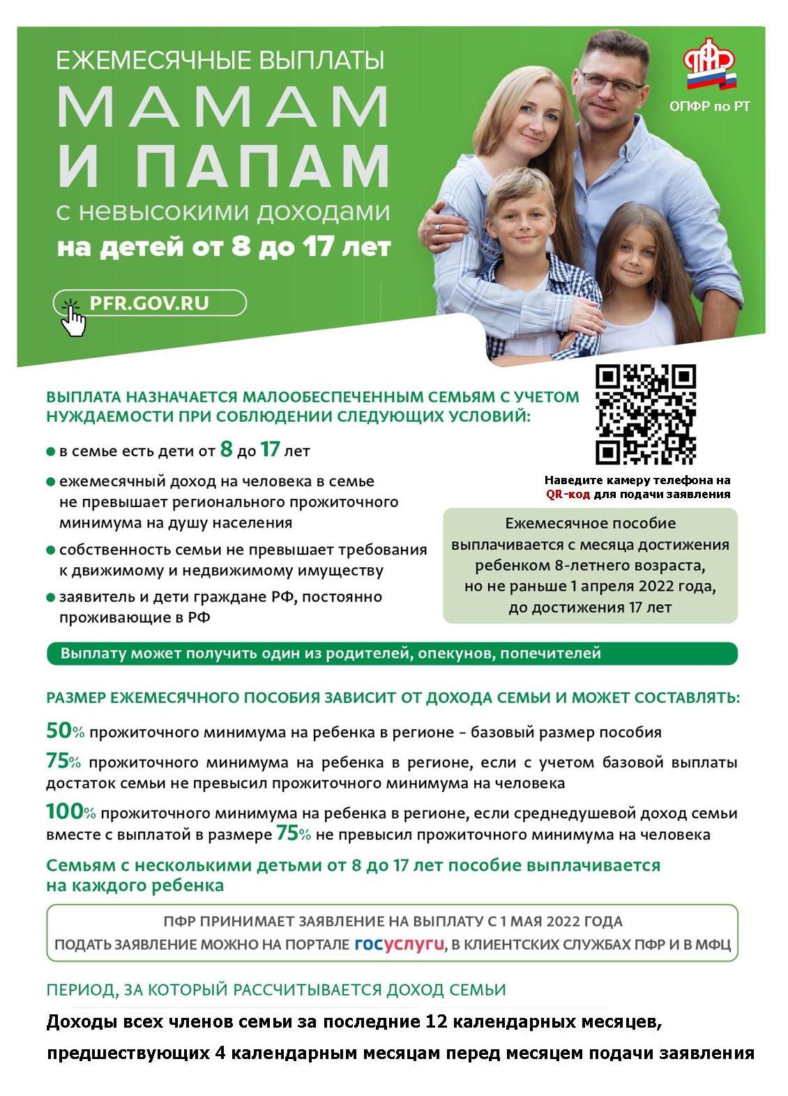 В соответствии с Указом Президента Российской Федерации от 31 марта 2022 года № 175 «О ежемесячной денежной выплате семьям, имеющим детей» с 1 апреля 2022 года по линии органов ПФР предусмотрено назначение ежемесячной денежной выплаты на детей в возрасте от восьми до семнадцати лет, семьям, среднедушевой доход которых не превышает величину прожиточного минимума на душу населения, установленную в субъекте Российской Федерации в соответствии с Федеральным законом от 24 октября 1997 года № 134-ФЗ «О прожиточном минимуме в Российской Федерации» на дату обращения за назначением ежемесячной выплаты на условиях, предусмотренных Постановлением Правительства РФ от 09.04.2022 № 630 «Об утверждении основных требований к порядку и условиям предоставления ежемесячной денежной выплаты на ребенка в возрасте от 8 до 17 лет, примерного перечня документов (сведений), необходимых для назначения указанной ежемесячной выплаты, и типовой формы заявления о ее назначении».
