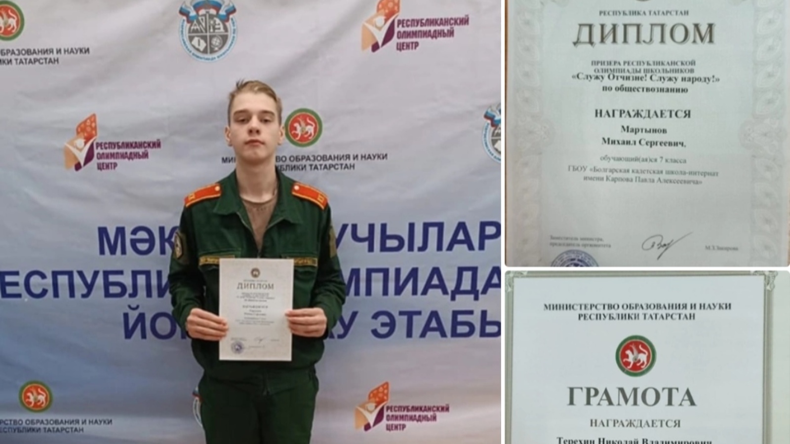 Призером республиканской олимпиады по обществознанию среди кадетских школ стал ученик 7 класса Болгарской кадетской школы-интернат имени Карпова Мартынов Михаил (Учитель: Терехин Н.В.)