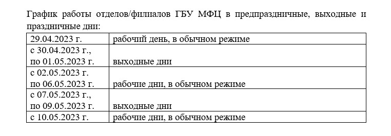 График работы отделов/филиалов ГБУ МФЦ в предпраздничные, выходные и праздничные дни