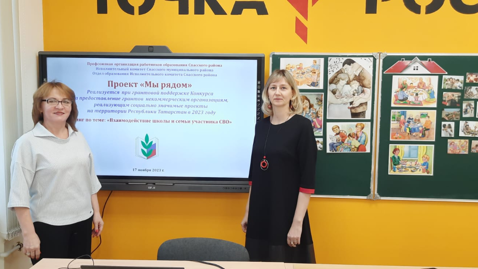 Сегодня в рамках реализации проекта "Мы рядом", который реализуется территориальной профсоюзной организации работников образования Спасского района при грантовой поддержке Конкурса на предоставление грантов некоммерческим организациям, реализующим социально-значимые проекты на территории муниципальных образований Республики Татарстан, проведён второй тренинг для классных руководителей по теме " Взаимодействие школы и семьи участников СВО". Тренинг подготовлен и проведен на базе Болгарской СОШ №1 психологом проекта Кузнецовой Натальей Владимировной. В целях повышения профессиональных компетенций учителей и классных руководителей. Проведён мастер-класс для организации встречи с родителями, рассмотрены формы проведения родительских собраний, способы взаимодействия с родителями, педагогам оказана методическая помощь.