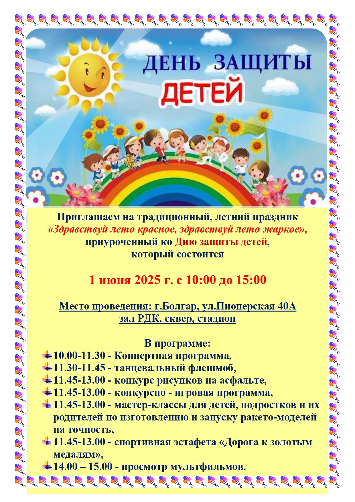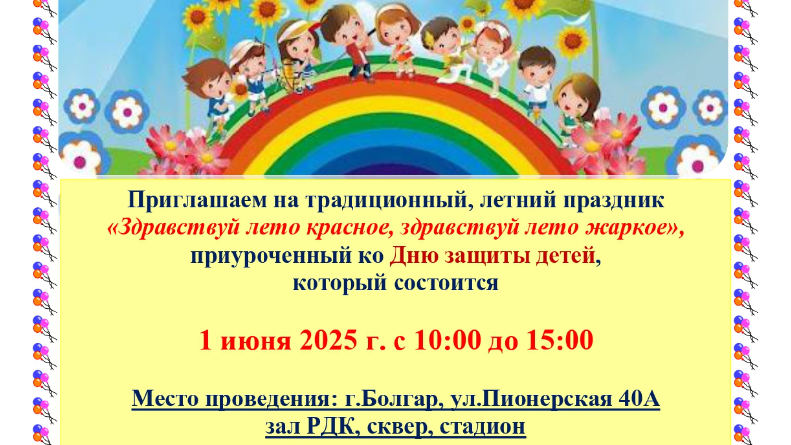 Приглашаем на традиционный, летний праздник «Здравствуй лето красное, здравствуй лето жаркое», приуроченный ко Дню защиты детей, который состоится 1 июня 2025 г. с 10:00 до 15:00