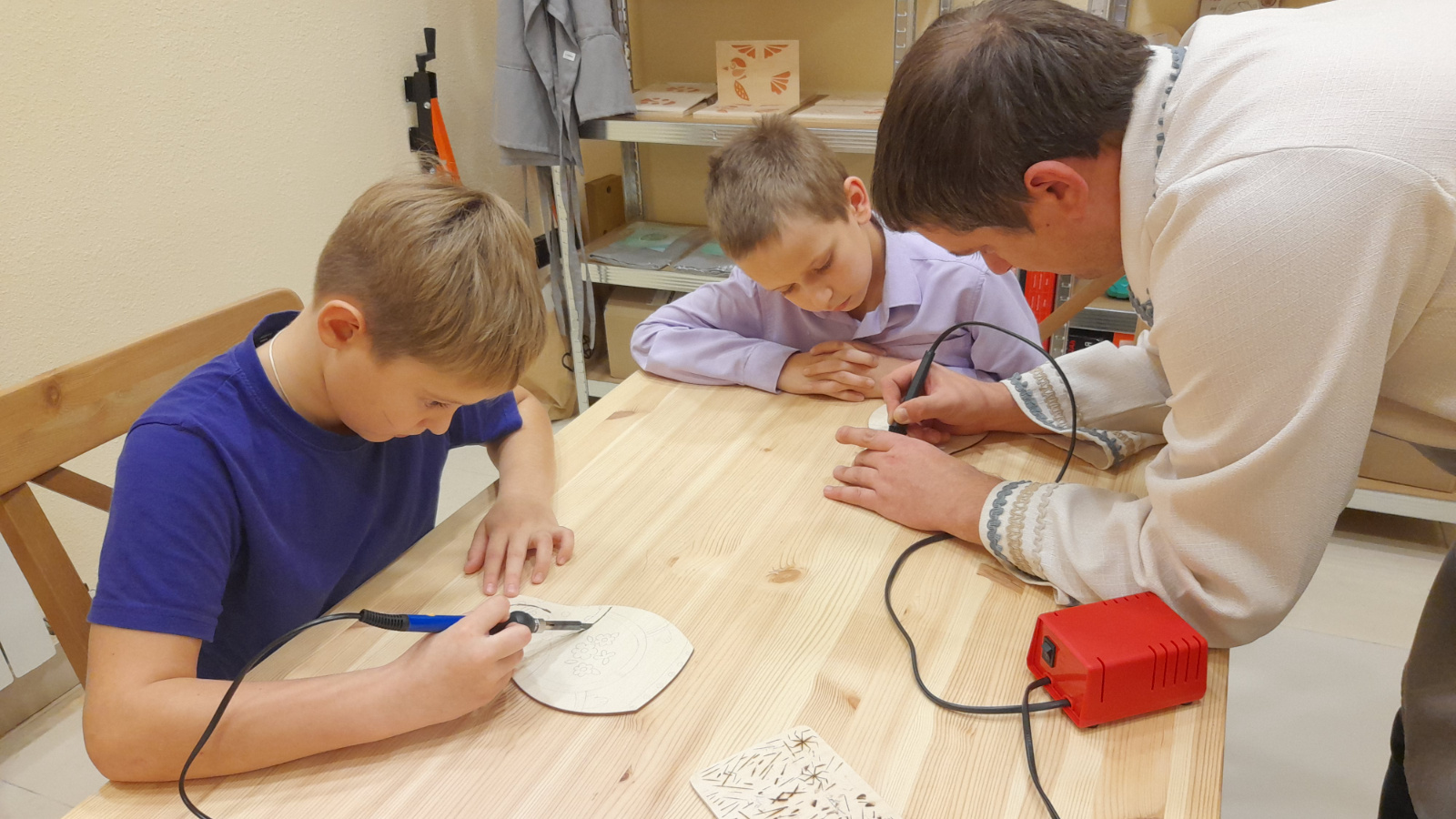 Мальчишки освоились с инструментами в столярной мастерской и попробовали выжигание по дереву.