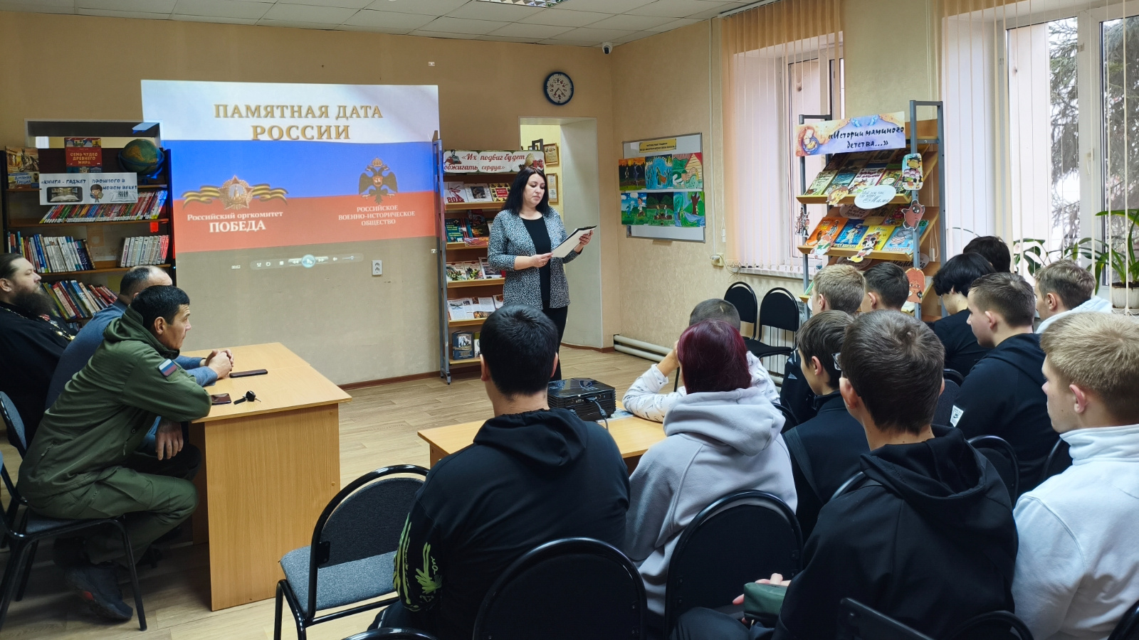 8 декабря в детской библиотеке прошел патриотический час «Герои России, герои страны», на который были приглашены студенты СТОТ. Основной целью таких встреч с детьми является расширение их знаний о героических страницах истории нашего Отечества, а также воспитание патриотизма, чувства гордости и уважения к историческому прошлому Родины. В мероприятии приняли участие почетные гости: Алексей Владимирович Костин – ветеран боевых действий на Северном Кавказе, социальный координатор Фонда «Защитники Отечества», Евгений Викторович Савинов – помощник социального координатора Фонда «Защитники Отечества», отец Серафим - ветеран боевых действий на Северном Кавказе, Кавалер Ордена Мужества, Алишер Базарович Равшанов – ветеран боевых действий на Северном Кавказе, участник СВО.