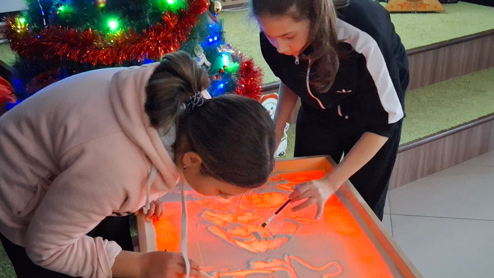Ведущая мероприятия познакомила учащихся с секретами техники рисования песком и уникальным оборудованием, используемым для создания анимации, после чего ребята окунулись в творческий процесс, создав собственные миниатюрные шедевры из песка.
