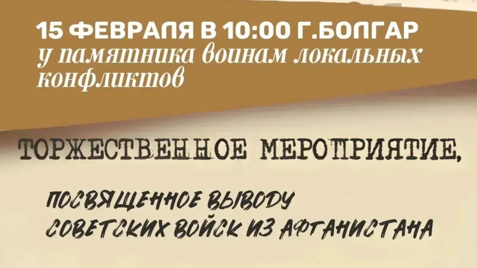 15 февраля в 10:00 у памятника воинам локальных конфликтов в городе Болгар состоится торжественный митинг