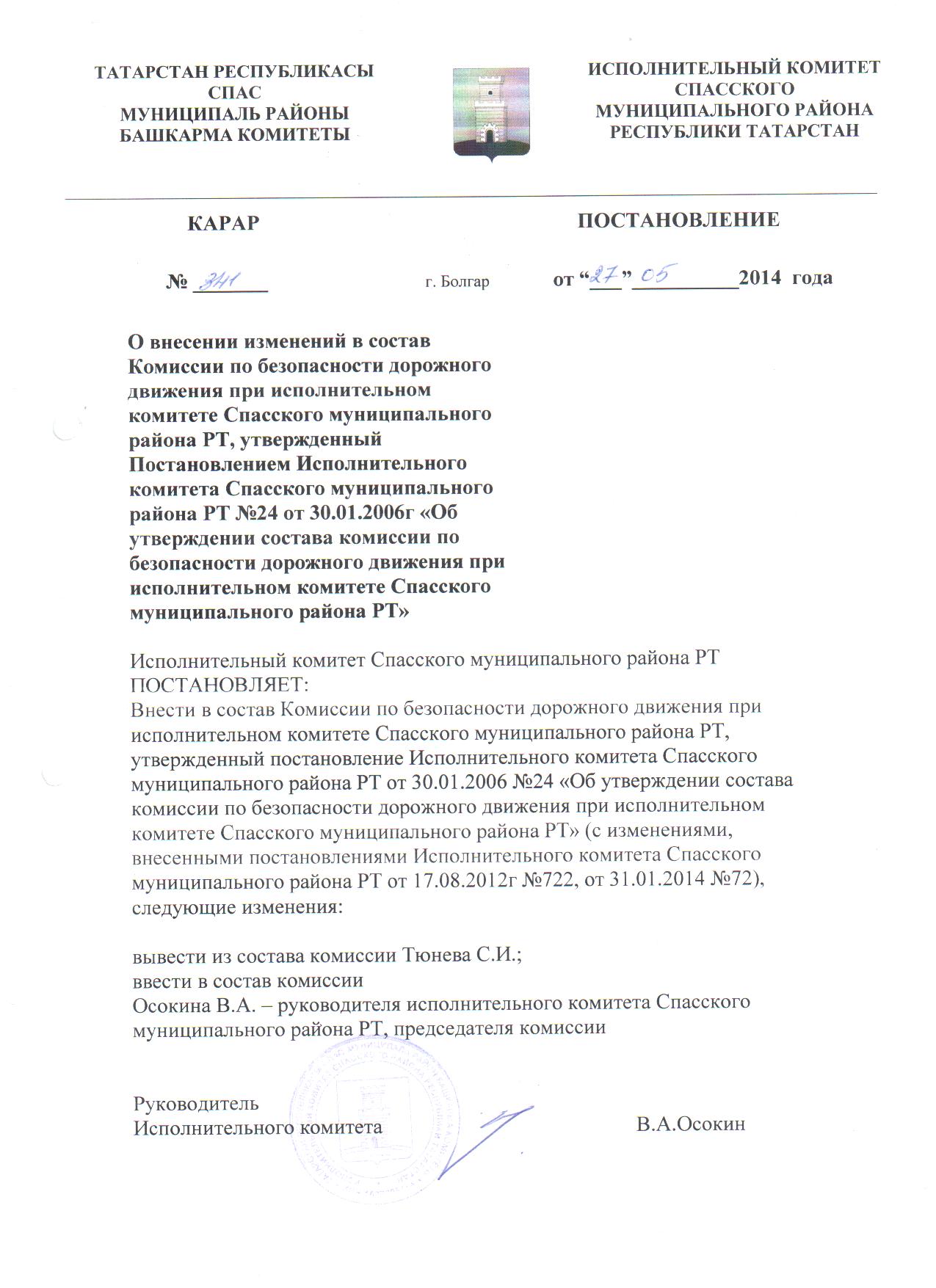 Постановление № 341 от 27.05.2014г. "О внесении изменений в состав комиссии по безопасности дорожного движения при Исполнительном комитете Спасского муниципального района РТ, утверждённый Постановлением Исполнительного комитета Спасского МР РТ № 24 от 30.01.2006г. "Об утверждении состава комиссии по безопасности дорожного движения при Исполнительном комитете Спасского муниципального района""