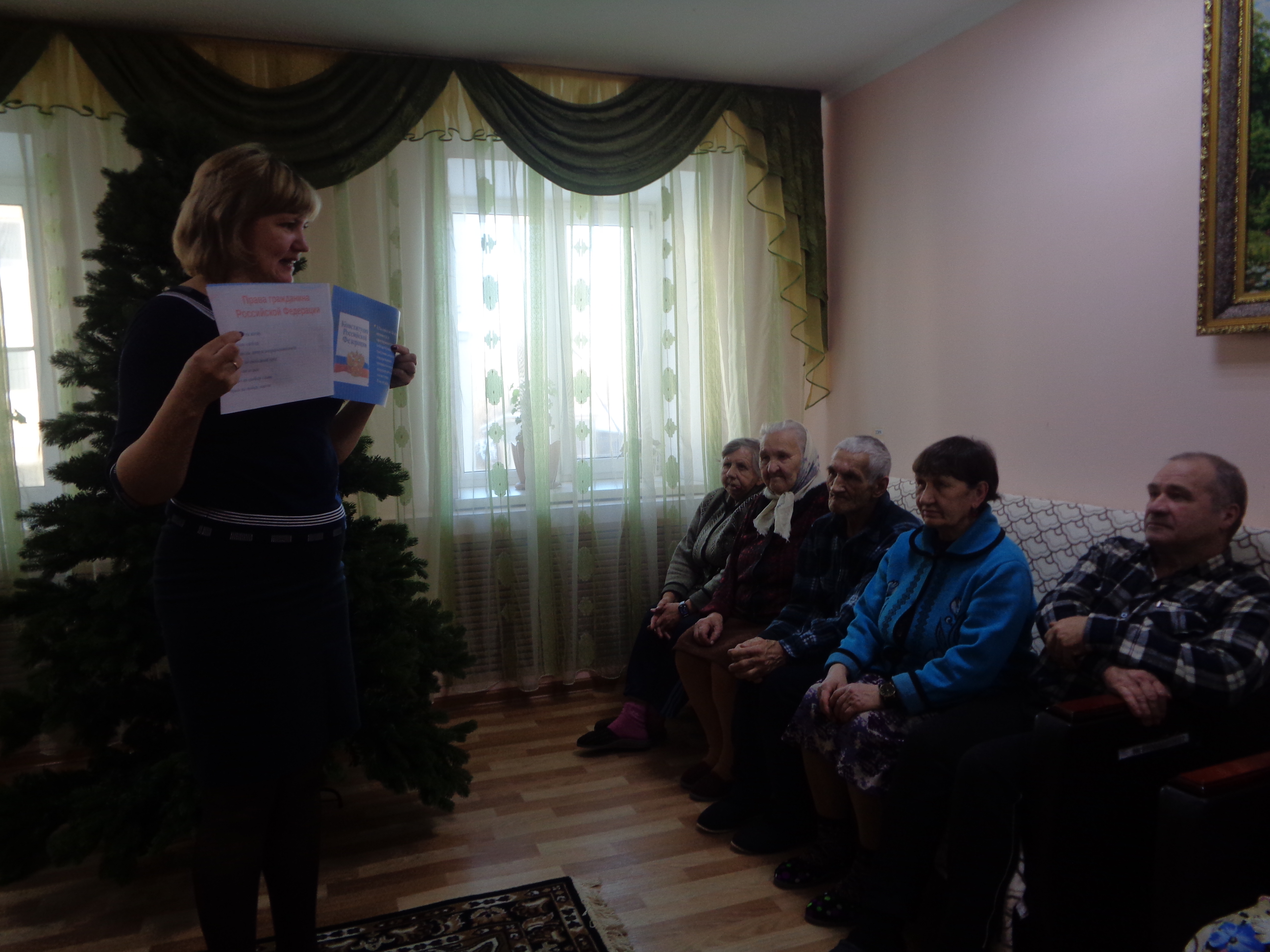 Бүген, 2018 елның 12 нче декабрендə, Спас картлар һəм инвалидлар интернат-йортында тəрбияче Шишкина Р.Г. тарафыннан "Россия Федерациясе көне"нə багышланган хокукый əңгəмə үткəрелде. Əңгəмə барышында тəрбияче социаль хезмəт алучыларны Кеше хокуклары декларациясе, Россия Федерациясе Конституциясе тарихы белəн таныштырды, шулай ук Конституциядə күрсəтелгəн төп законнар турында сөйлəде һəм гражданнарның хокуклардан кала бурычлары да булуын əйтеп үтте.