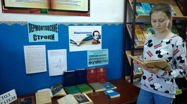 Китап күргәзмәләре балаларның да, өлкәннәрнең дә игътибарын җәлеп итте:» минем иҗат итү хыялымны яратам", балалар китапханәсендә " Лермонтов. Герой вакытсыз» Кузнечиха авылында, Урта Йорткүл авылында» Өмет һәм хыяллар җилкәне астында«, Идел буе авылында» М. Ю. Лермонтов – безнең горурлыгыбыз«,» ... һәм буря белән Мин «Ямбакты авылында/б, Аграмак авылында» тынгысыз тормыш битләре " дип атар идем. Лермонтов-ул тормыш кебек, тирән һәм Бөек "Иж-Борискино авылында", Көек авылында» Лермонтов юлын өстендә«, Бураково авылында» тынгысыз Илһам гение«, танки авылында» Лермонтов һәм аның чоры«. "Китап планетасы Лермонтова»," Книжная планета Лермонтова " һ.б. материаллар китапханә кунакларына Михаил Юрьевич Лермонтовның искиткеч әсәрләрен искә төшерергә, аның биографиясе битләрен актарырга, күренекле рус язучысы һәм шагыйрь тормышыннан һәм иҗатыннан аз билгеле фактлар белән танышырга мөмкинлек бирде.