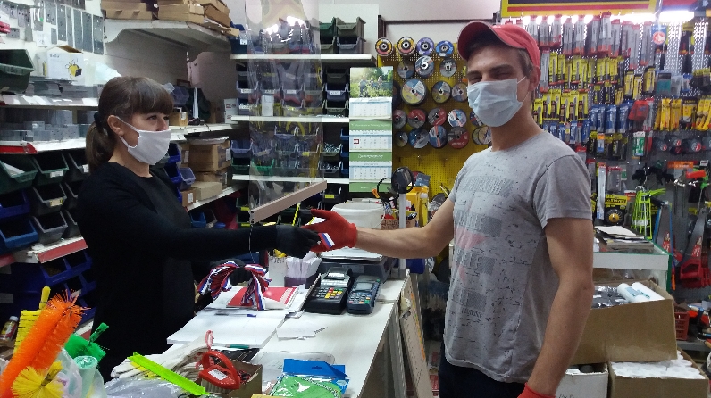 “Без бергә” район штабы волонтерлары “Бердәм Россия” Спас җирле партиясе белән берлектә азык-төлек, яшелчә, төзелеш, әйбер кибетләре, даруханә, АЗС һ.б. буенча “Триколор” тасмаларын тараттылар.