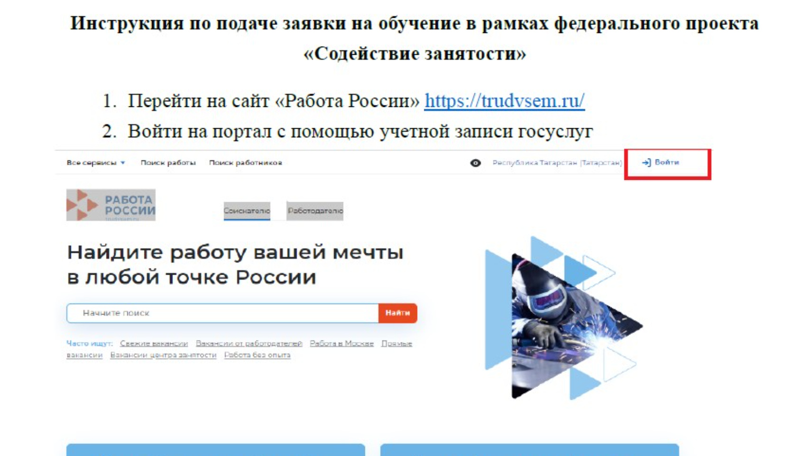 2021 елдан Татарстан Республикасында «Демография» милли проектының «мәшгульлеккә ярдәм» федераль проекты кысаларында гражданнарның аерым категорияләренә һөнәри белем бирүне һәм өстәмә һөнәри белем бирүне оештыру программасы гамәлгә ашырыла (алга таба – Программа). Программа Россия Федерациясе Хөкүмәте тарафыннан имин булмаган санитар-эпидемиологик хәл һәм тиешле тискәре финанс-икътисади нәтиҗәләр, предприятиеләр һәм оешмаларның икътисади тотрыксызлыгы аркасында хезмәт базарында киеренкелекне киметү мәсьәләсен хәл итү максатыннан гамәлгә ашырыла.