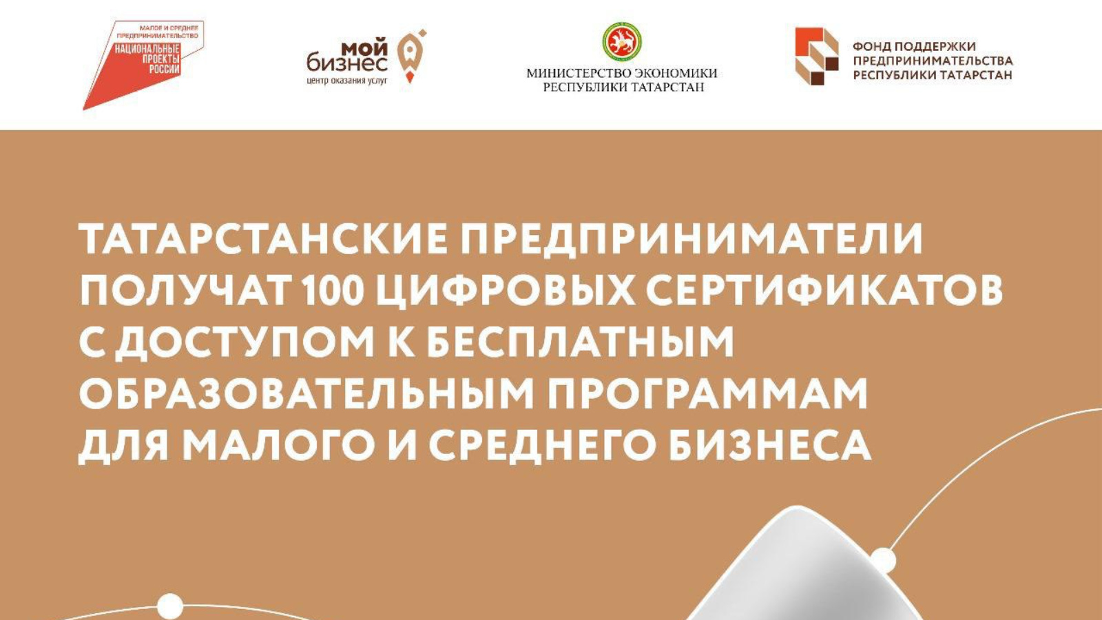 Татарстан эшмәкәрләре кече һәм урта бизнес өчен түләүсез белем бирү программаларыннан файдалана алырлык 100 цифрлы сертификат алачак. Бизнесның яңа технологияләренә өйрәтү өчен сертификатлар "Кече һәм урта эшкуарлык" милли проектын гамәлгә ашыру кысаларында агымдагы ел ахырына кадәр бүленәчәк.