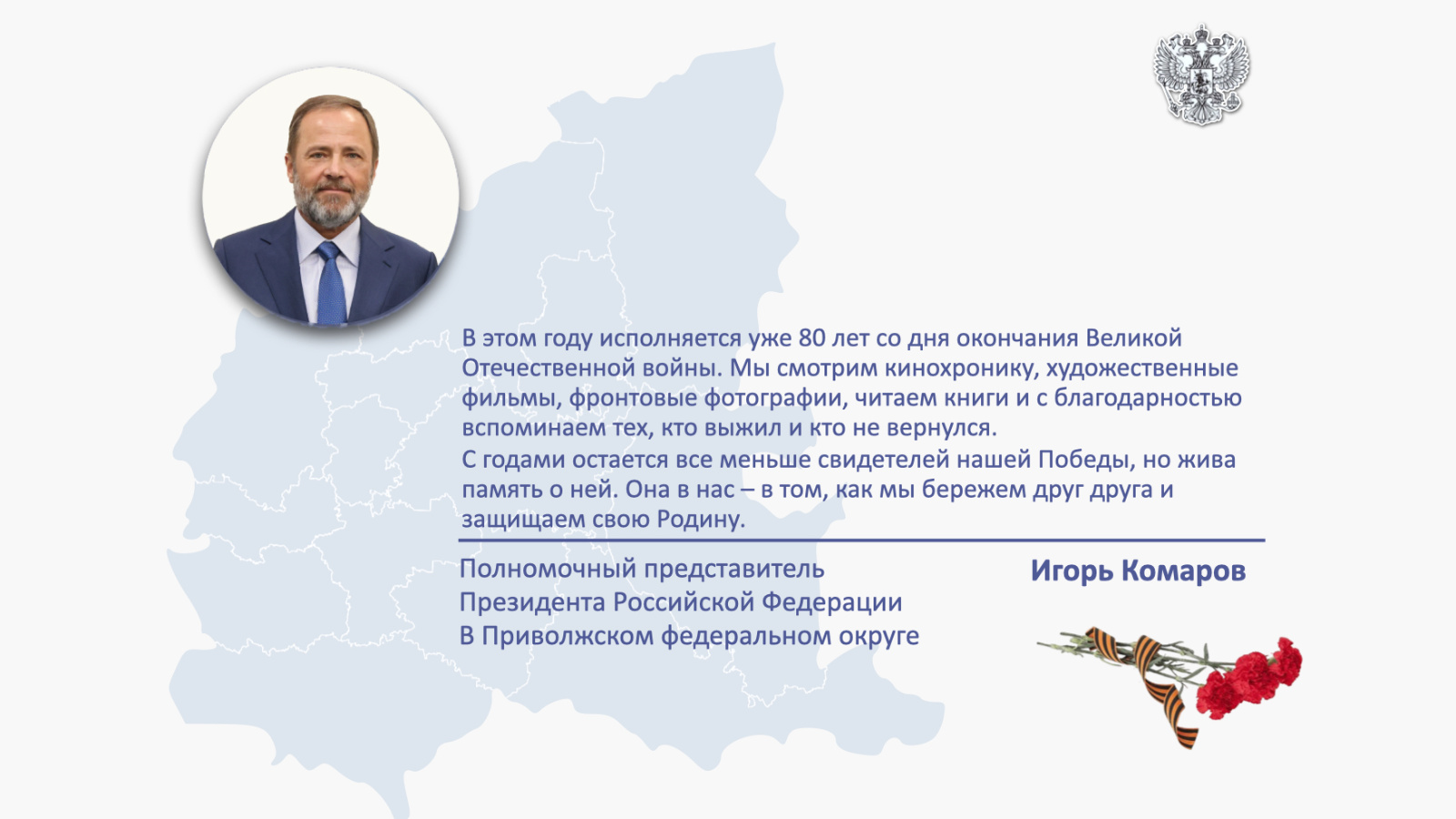 Хөрмәтле Идел буе федераль округында яшәүчеләр, Сезне Бөек бәйрәм – Җиңү көне белән котлыйм!
