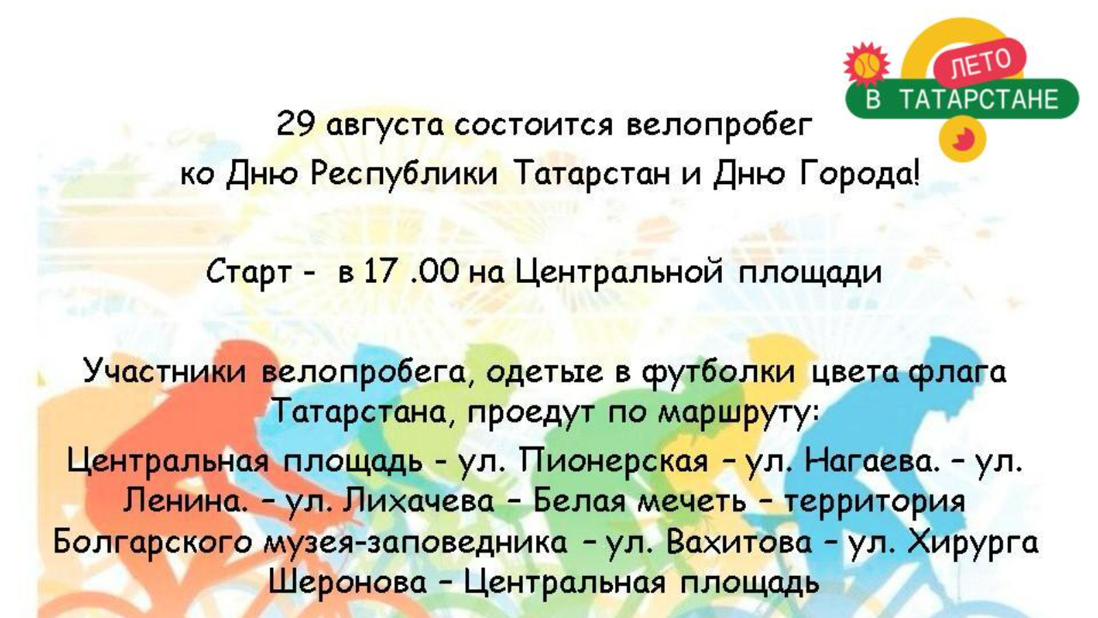 Сезне мавыктыргыч вакыйгага — 29 августта 17:00 сәгатьтә Үзәк мәйданда узачак велопробегка кушылырга чакырабыз!